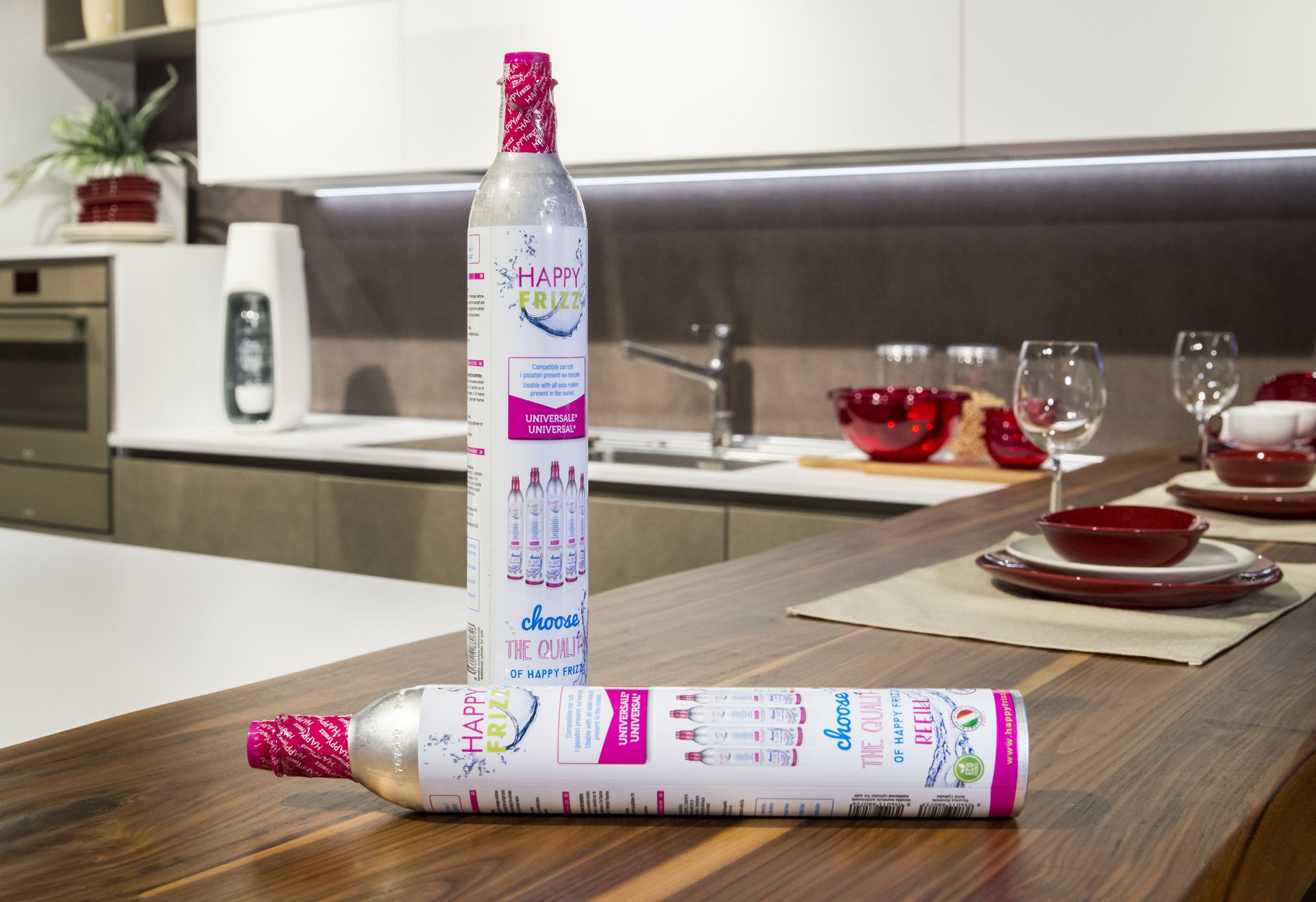 Happy Frizz offers a 425g CO2 Cylinder for Water Carbonators, featuring a universal screwing design compatible with all soda machines, except Terra, Art, and Duo Sodastream models, which support quick connect coupling. Each cylinder can make up to 60L of sparkling water.