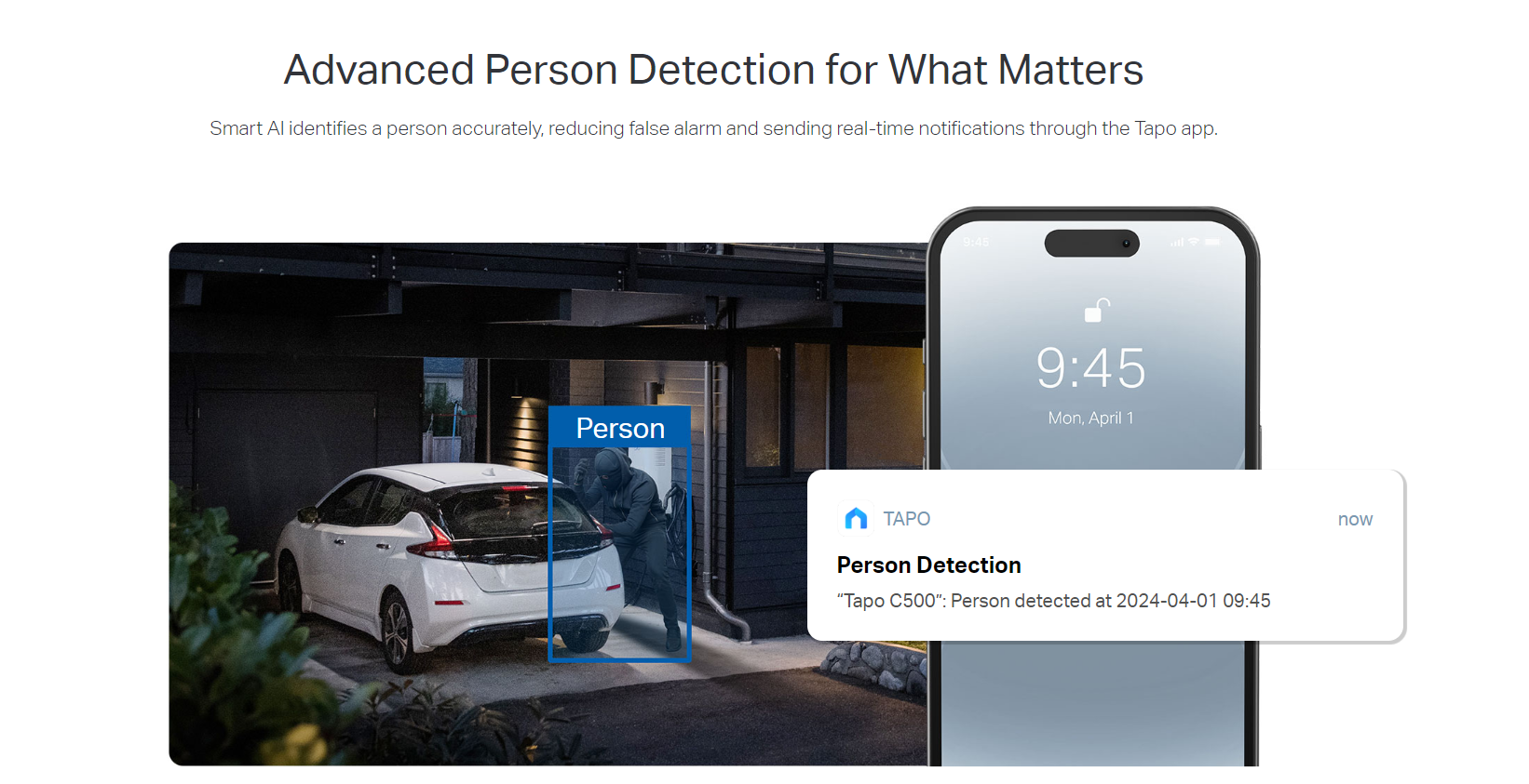 • Person Detection: Smart AI identifies a person accurately, sending instant notifications through the Tapo app.