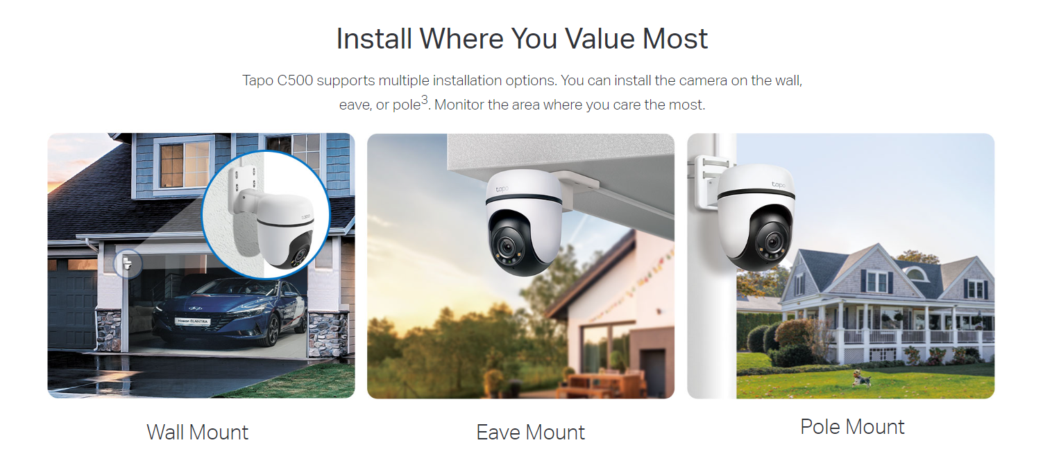 • Multiple Installations: Install the camera on the wall, eave, or pole3. Monitor the area where you care the most.
