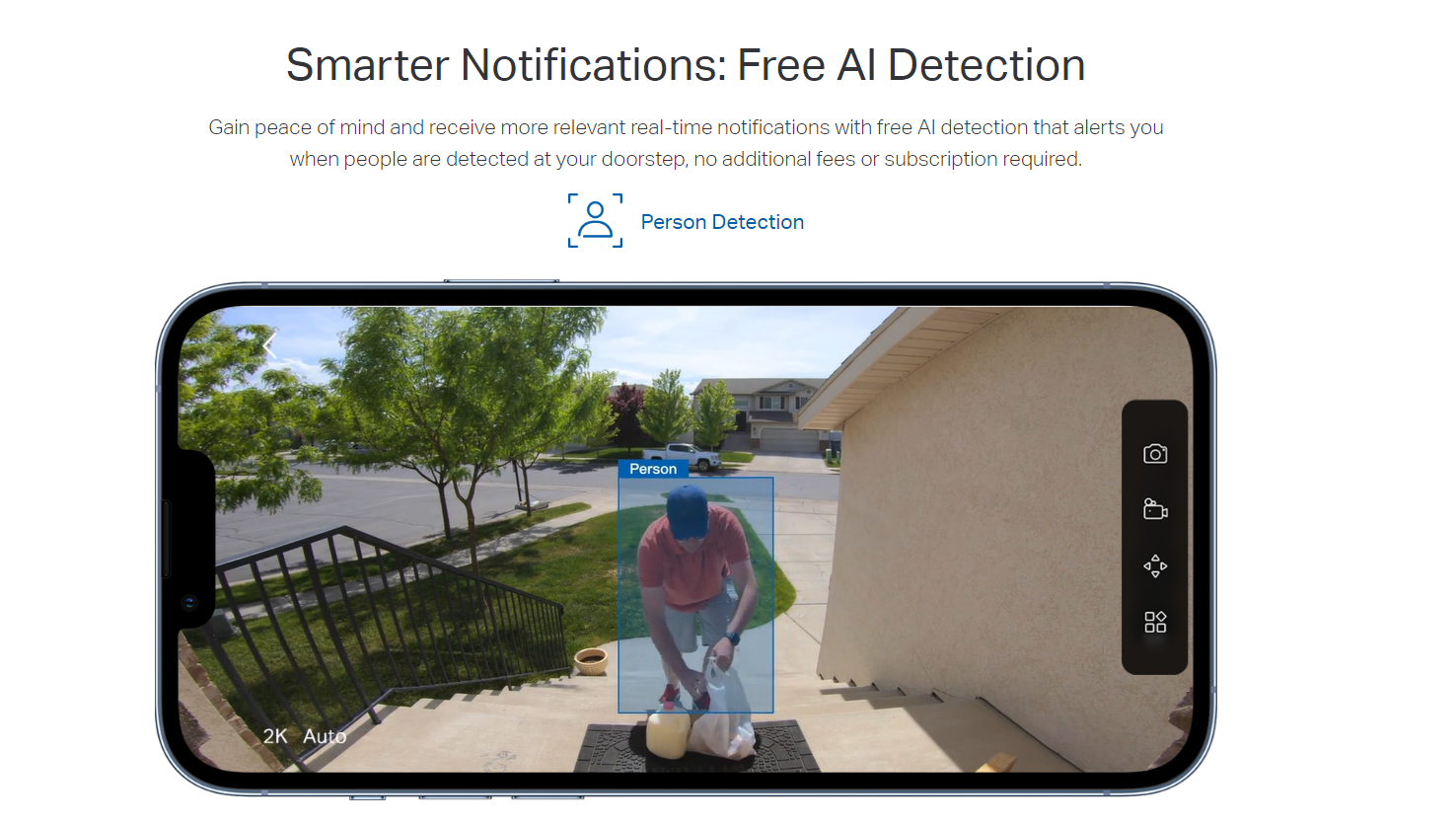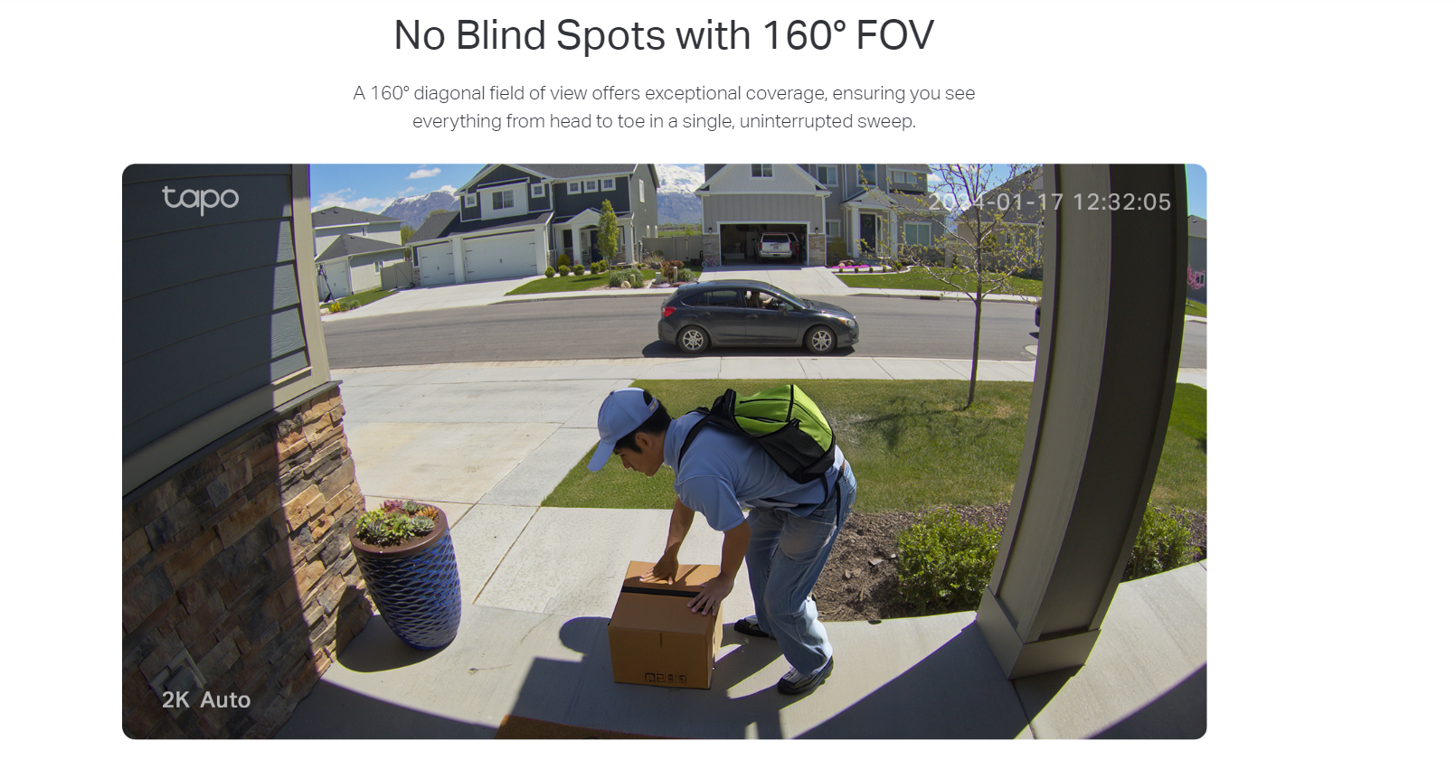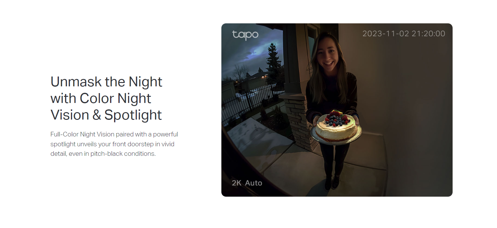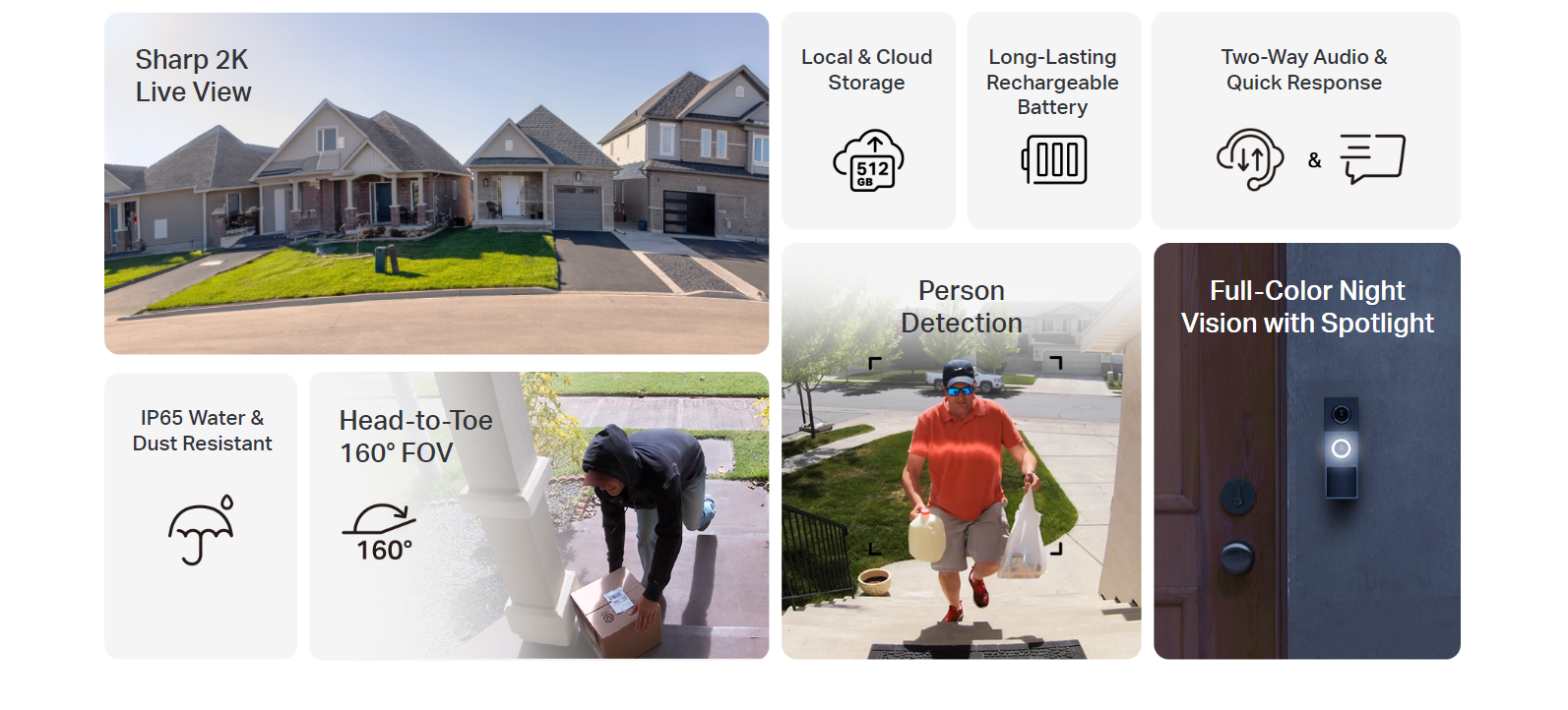6-Month Battery Life: Enjoy long-lasting security with fewer charges, ensuring continuous protection and convenience. 2K Clarity: Provides finer details and incredible clarity. 160° Ultra-Wide View: Captures everything from head-to-toe. Full Color Night Vision with Spotlight: Vivid night visibility and security. Free Detection and Notification: Alerts for person. Two-Way Audio: High-quality talk with premium mic and speakers.