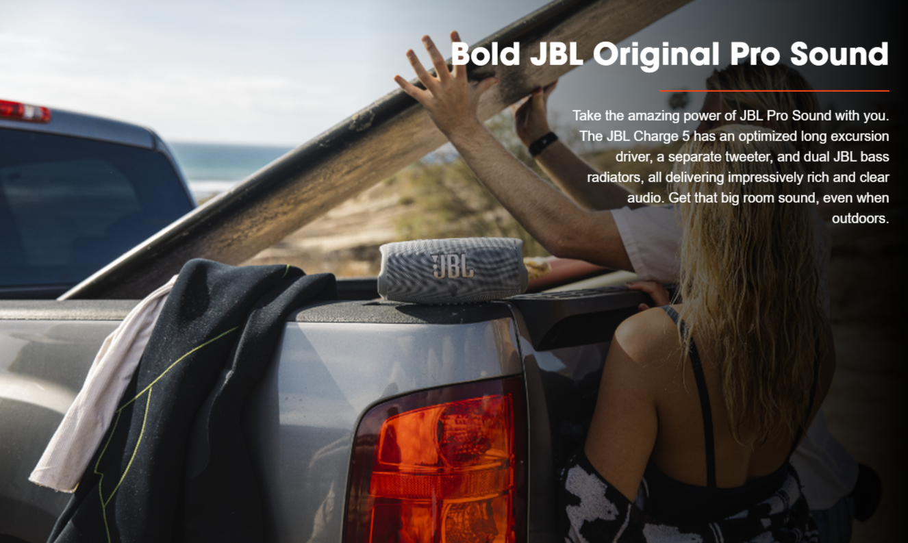 Take the party with you no matter what the weather. The JBL Charge 5 speaker delivers bold JBL Original Pro Sound, with its optimized long excursion driver, separate tweeter and dual pumping JBL bass radiators. Up to 20 hours of playtime and a handy powerbank to keep your devices charged to keep the party going all night. Rain? Spilled drinks? Beach sand? The IP67 waterproof and dustproof Charge 5 survives whatever comes its way. Thanks to PartyBoost, you can connect multiple JBL PartyBoost-enabled speakers for a sound big enough for any crowd. With all-new colors inspired by the latest street fashion trends, it looks as great as it sounds.