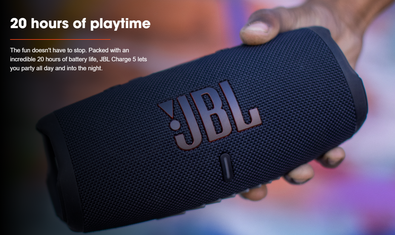 Take the party with you no matter what the weather. The JBL Charge 5 speaker delivers bold JBL Original Pro Sound, with its optimized long excursion driver, separate tweeter and dual pumping JBL bass radiators. Up to 20 hours of playtime and a handy powerbank to keep your devices charged to keep the party going all night. Rain? Spilled drinks? Beach sand? The IP67 waterproof and dustproof Charge 5 survives whatever comes its way. Thanks to PartyBoost, you can connect multiple JBL PartyBoost-enabled speakers for a sound big enough for any crowd. With all-new colors inspired by the latest street fashion trends, it looks as great as it sounds.