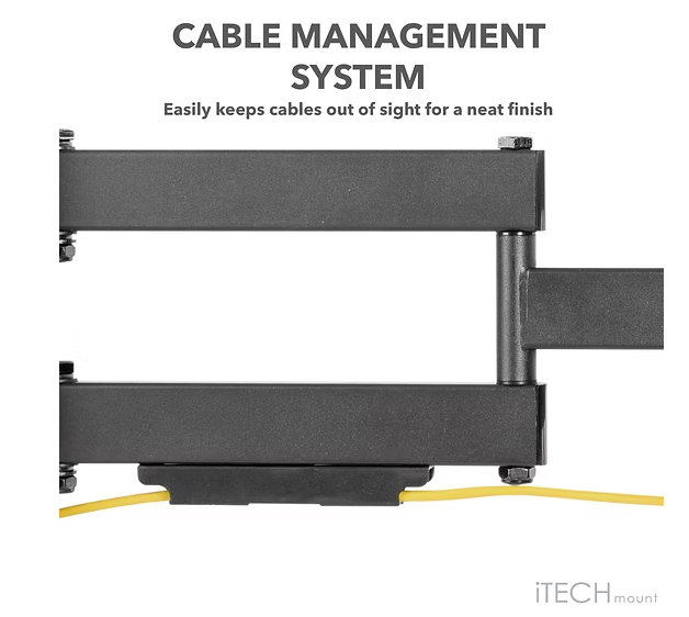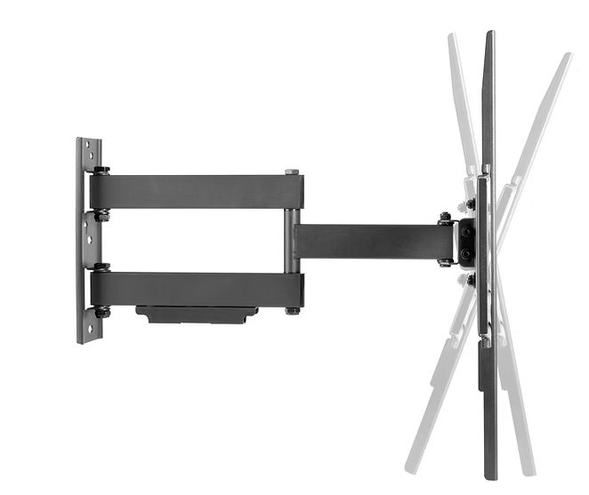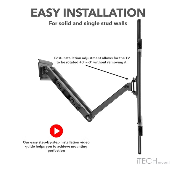 the ITECH Full motion double arm wall mount bracket with 3 movements suitable for TVs from 37" to 80". Extendable from wall and holds up to 50kg in weight. Post-installation level adjustment allows the TV to be adjusted up to 3 degree clockwise and anti-clockwise to ensure it is perfectly level