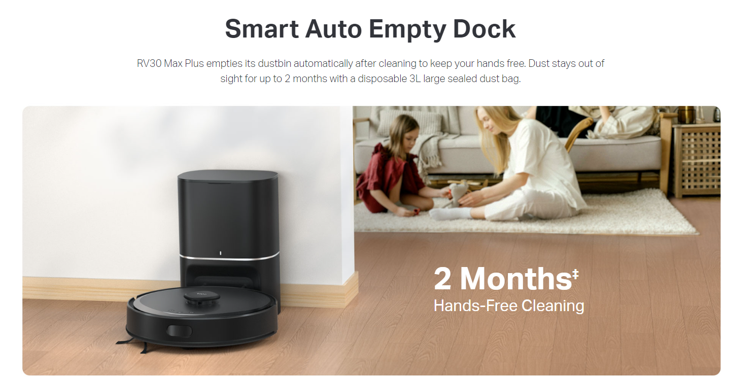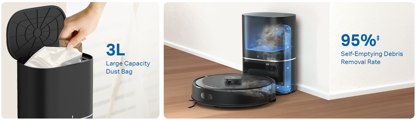 - Auto-Empty with 3L Large Dust Bag - Dust stays out of sight for up to 2 months with a disposable 3L large sealed dust bag.