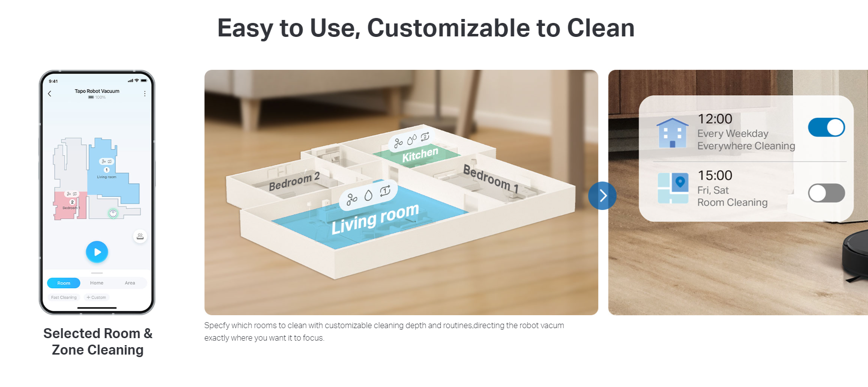 - Customizable Cleaning - Merge and separate areas, set a cleaning schedule, and customize clean modes for each room.