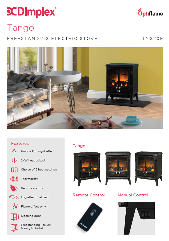 The Tango electric stove incorporates the unique Optiflame flame effect providing up to 2kW of heat and can be controlled by the easy-to-use remote control or the manual controls located behind the opening doors.