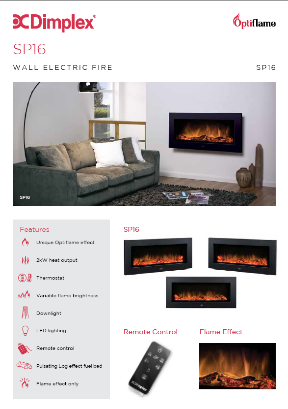 The stunning black SP16E features a wide flame picture, providing an impressive centre piece for your room.Dimplex Optiflame technology with LED lighting illuminates the log fuel bed to create a cosy flame effect that can be enjoyed with or without heat.The concealed heater has an output of 2kW, with choice of 2 heat settings: 1kW or 2kW , the variable thermostat allows you to adjust the temperature to suit your room.The SP16E also comes with a handy remote control to allow ease of use.This fire is designed for wall mounting or the chassis can be recess into the wall.