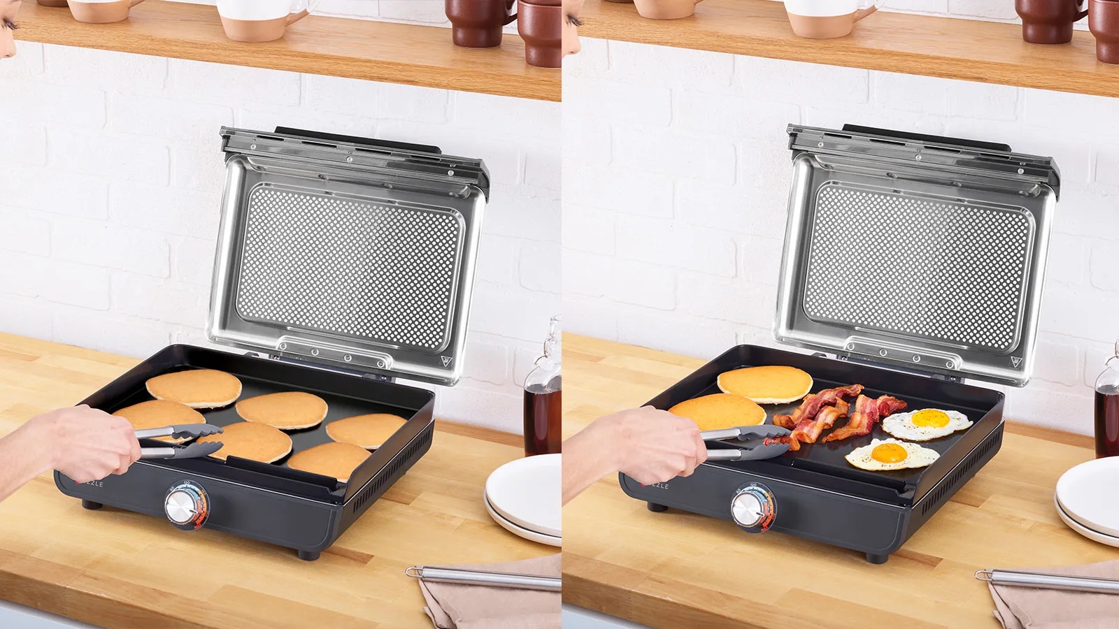 Two interchangeable plates make it easy to create sizzling dishes right on your kitchen worktop – from chargrilled chicken breasts and smash burgers to seared fajita vegetables and fluffy pancakes.