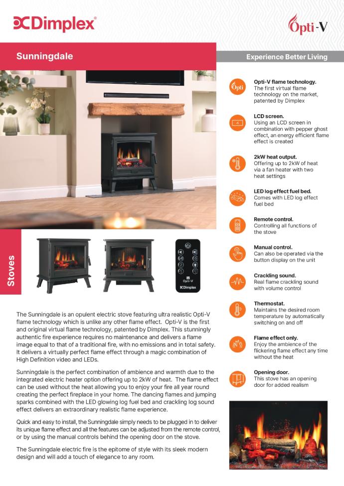 The Sunningdale features Dimplex's ultra realistic Opti-V flame technology which is unlike any other flame effect. This electric stove is the prefect combination of ambience and warmth due to the optional integrated heater offering up to 2kW of heat. The dancing flame and jumping sparks combined with the LED glowing log fuel bed and crackling log sound effect deliveries an extraordinary realistic flame experience.