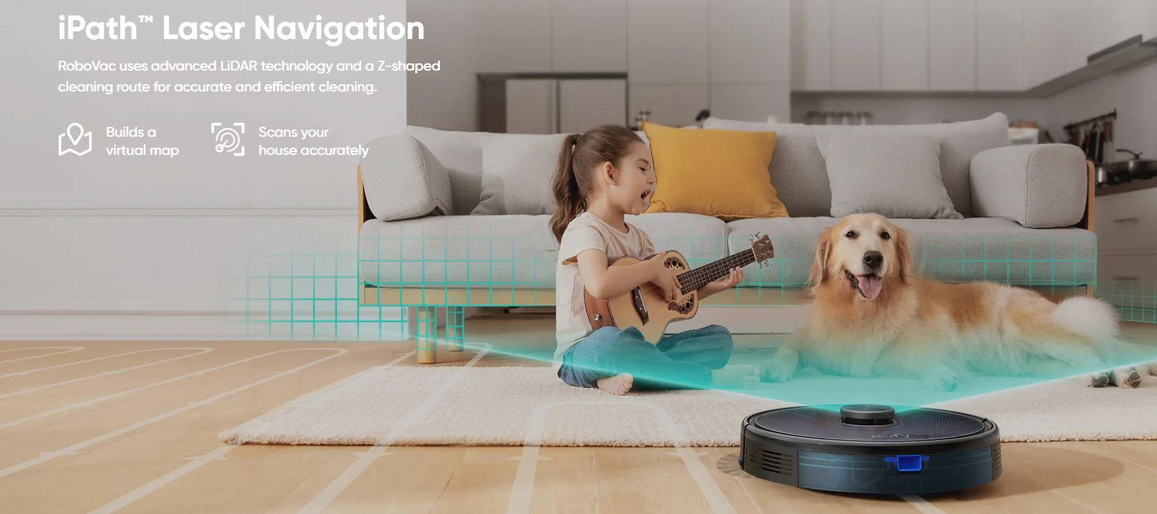 iPath Laser Navigation: Using advanced LiDAR technology to scan your home, RoboVac can build a real-time map to navigate its way through your space precisely. It also uses a Z-shaped path for a more efficient clean.