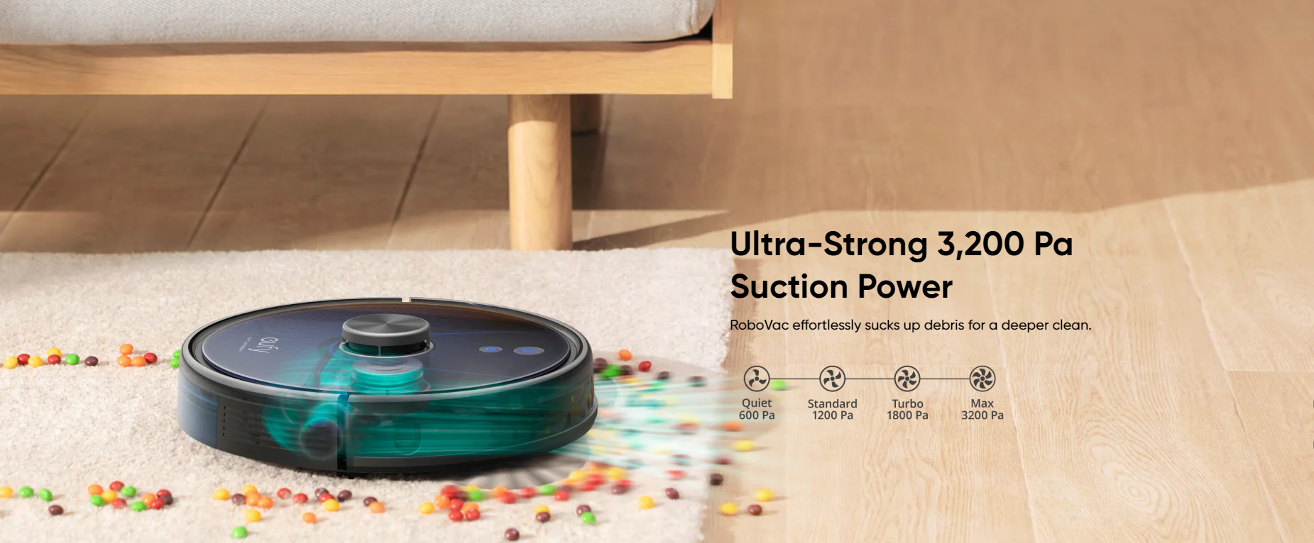 Ultra-Strong 3,200 Pa Suction: 4 levels of suction with up to 3,200 Pa of power ensure that dirt, crumbs, pet hair, and more are efficiently removed from hard floors and carpets for a superior clean.