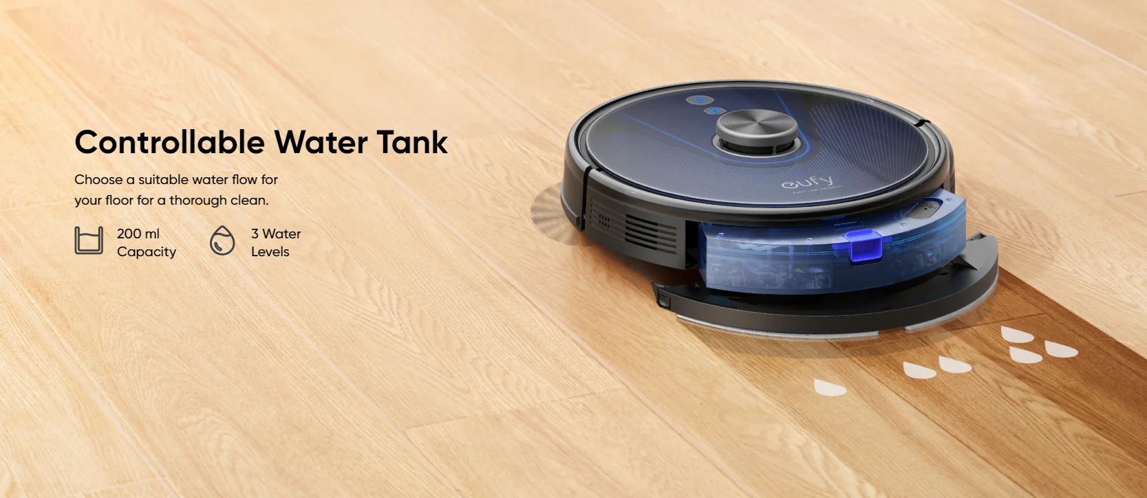 Controllable Water Tank: RoboVac's 200 ml electronic water tank can be conveniently controlled via the app to allow you to switch between 3 water flow levels when cleaning different floor types.